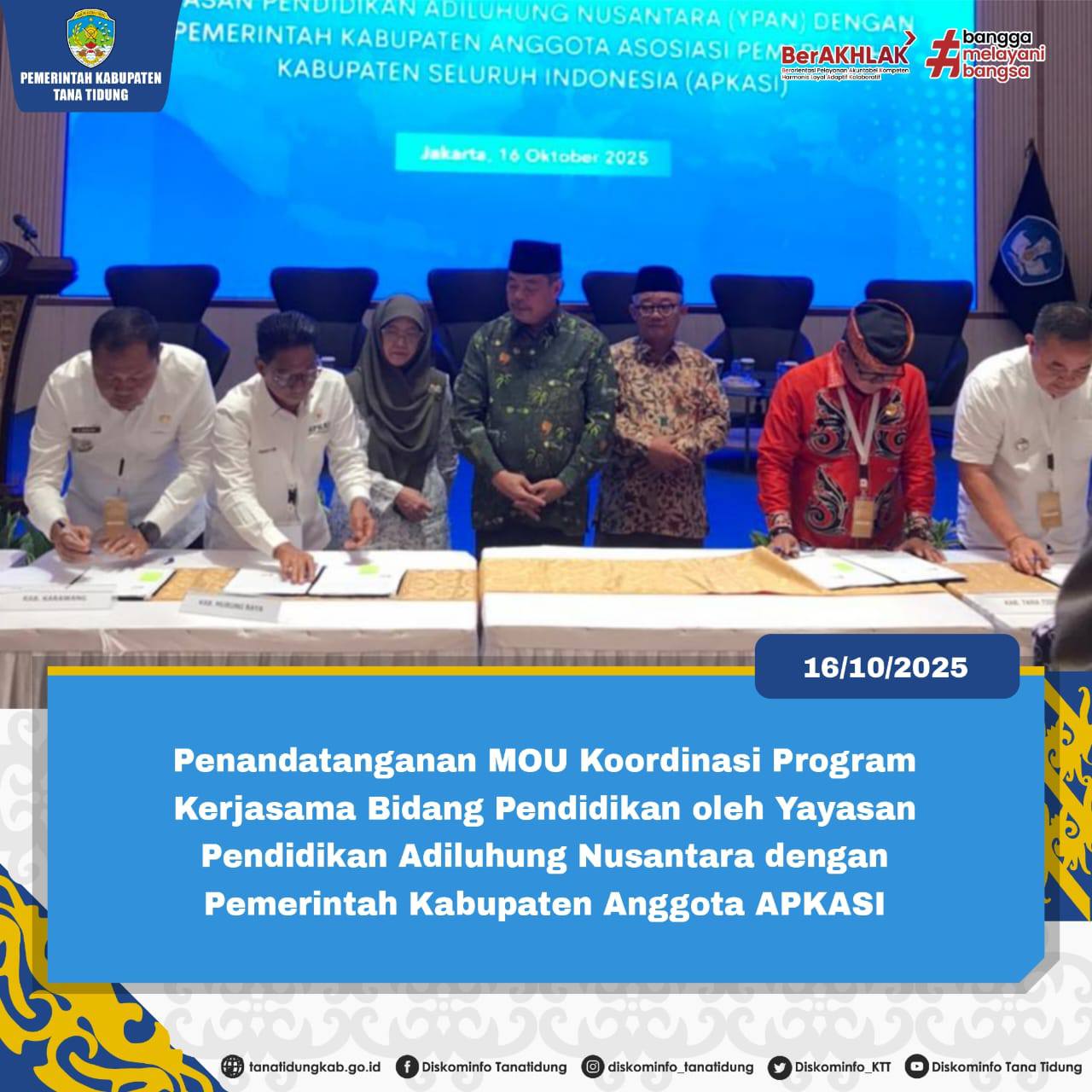 Pada kesempatan tersebut, juga dilaksanakan penandatanganan Nota Kesepahaman (MoU) antara Yayasan Adiluhung Nusantara dan Pemerintah Daerah Kabupaten Tana Tidung dalam bidang pendidikan. Langkah ini merupakan upaya strategis untuk meningkatkan kualitas dan akses pendidikan di wilayah Kabupaten Tana Tidung.